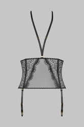 Waist-cincher suspender belt in recycled lace. Shape combining an eyelash lace with see-through tulle edged with picot elastic. Graphic cut that accentuates the waist. Suspenders and choker harness are removable and can be adjusted with gold-tone accessories. Flexible vertical whalebones for improved structure and support. Adjustable hook-and-eye fastening on the back. Can be worn as a suspender belt or a waist-cincher.