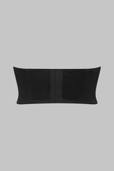 Bustier shape with flexible vertical boning in the front and back. Fastens at the back with a adjustable clip.