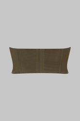 Bustier shape with flexible vertical boning in the front and back. Fastens at the back with a adjustable clip.