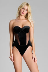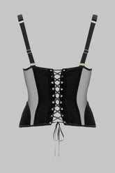 Quilted velvet enhances the bust and hips, contrasted by ultra-sheer tulle panels along the sides that trace clean lines down the torso. The wide straps, velvet-covered at the front, are adjustable and removable to suit any styling desire. At the back, an adjustable lace-up fastening with gold eyelets and jewelry-like tips allows for a close-fitting, waist-defining silhouette.