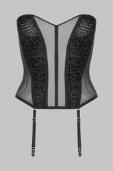 The absolutely transparent tulle suspender corset is structured with supple vertical stays at the front and back and hand embroidered with ultra-shiny black beads that are sure to make a statement. Transverse seams extending into adjustable and removable suspenders call for stockings to complete the look. It is fastened at the back with a smooth and fine adjustable clip.