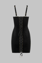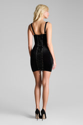 At the back, an adjustable lace-up detail — adorned with gold eyelets and jewelry-like tips — ties at the waist and hem. A floating velvet lining sits beneath the lacing, allowing the dress to be worn fully opaque or left open to reveal the skin beneath.