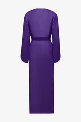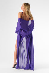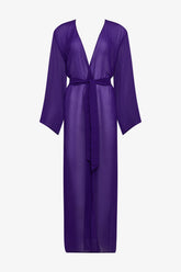 Le kimono Fever est réalisé en crêpe de viscose fluide et semi-transparente d’un violet électrique, parfait pour apporter de la légèreté à tous vos maillots de bain. Sa coupe longue, droite et fluide, est structurée par une ceinture amovible noire, aux bords biseautés, glissée dans deux passants latéraux. Les manches longues et larges renforcent l’allure ample et vaporeuse de cette pièce, idéale à porter sur un maillot ou en tenue habillée.