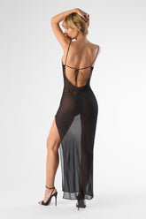 La robe longue dos nu Fever est réalisée en crêpe de viscose fluide et semi-transparente noire, pour une allure légère et élégante. Sa coupe légèrement ajustée épouse naturellement les formes du corps, tandis qu’une fente sur le côté gauche dévoile la jambe avec subtilité. Le dos nu est structuré par de fines bretelles à nouer, terminées par des embouts “lipstick” noirs gravés Maison Close, détail signature raffiné. Grâce à leur système coulissant, les bretelles permettent d’ajuster à la fois la profondeur du décolleté et la longueur de la robe, pour un tombé parfait.