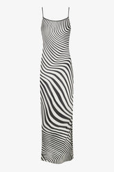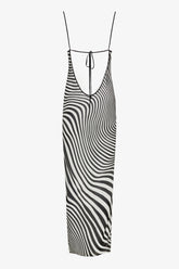 La robe longue dos nu Fever est réalisée en crêpe de viscose fluide et semi-transparente à l’imprimé psychédélique, pour une allure légère et élégante. Sa coupe légèrement ajustée épouse naturellement les formes du corps, tandis qu’une fente sur le côté gauche dévoile la jambe avec subtilité. Le dos nu est structuré par de fines bretelles à nouer, terminées par des embouts “lipstick” noirs gravés Maison Close, détail signature raffiné. Grâce à leur système coulissant, les bretelles permettent d’ajuster à la fois la profondeur du décolleté et la longueur de la robe, pour un tombé parfait.