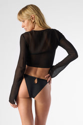 Le top manches longues Fever noir est confectionné dans une matière en crêpe de viscose légère et semi-transparente, parfaite pour les silhouettes estivales ou les superpositions raffinées. Ce modèle multipositionnable se noue à la taille, sur le devant ou dans le dos, pour créer différents effets selon l’envie. Son décolleté plongeant, porté devant ou derrière, renforce son allure sensuelle et modulable. Les manches longues légèrement évasées apportent un joli mouvement à la pièce, idéale aussi bien en bord de mer qu’en ville.