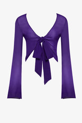 Le top manches longues Fever violet est confectionné dans une matière en crêpe de viscose légère et semi-transparente, parfaite pour les silhouettes estivales ou les superpositions raffinées. Ce modèle multipositionnable se noue à la taille, sur le devant ou dans le dos, pour créer différents effets selon l’envie. Son décolleté plongeant, porté devant ou derrière, renforce son allure sensuelle et modulable. Les manches longues légèrement évasées apportent un joli mouvement à la pièce, idéale aussi bien en bord de mer qu’en ville.