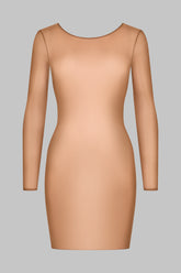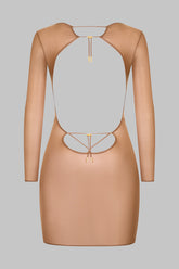 Short long sleeve dress with boat neckline crafted from a fine jersey with shiny, subtly sheer reflections. The front features a minimalist and refined silhouette, while the back is fully revealed down to the small of the back with delicately ruched lacing at the neck. The lacing is adjustable thanks to unique sliders and gold lipstick accessories signed by Maison Close.