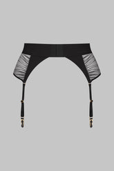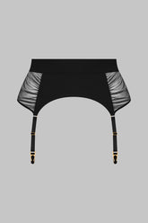 Bi-material garter belt with sides feature transparent tulle structured with pleated seams that define the hips. Adjustable elasticated waistband fastening in opaque material with a smooth, fine hook and eye fastening. The opaque front and back material offers discretion. Four adjustable, non-removable suspenders, with gold accessories, for stockings to complete the look.