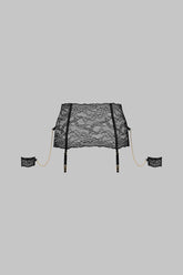Stretch floral lace suspender belt. Jewellery-style handcuffs with fine removable gold chains which can be attached or detached to suit you. Four black and gold suspenders give the garment structure.
