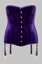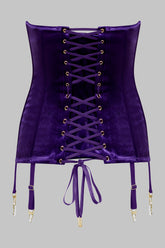 ROCOCO garter corset in velvet, inspired by traditional corsetry, designed to sculpt the waist and define the silhouette. Flexible steel boning and a firm inner lining shape a structured fit that creates a controlled push-up effect while ensuring comfortable wear.