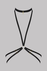 The VELVET SET black harness precisely highlights the lines of the bust. Made from soft velvet, it features adjustable straps that gently embrace the silhouette. A gold pendant engraved Maison Close signs this piece. Designed to be worn on its own or attached to the matching open panty, it creates the illusion of a bodysuit. A versatile lingerie accessory, delivered in its black velvet pouch.
