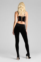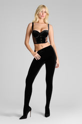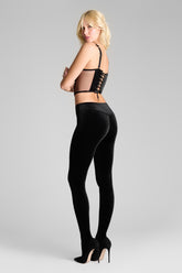ROCOCO leggings in full velvet, with a high-waisted cut that wraps the silhouette like a second skin. The seamless elastic waistband offers smooth, comfortable support — ideal to wear on its own, over, or under a corsetry piece.