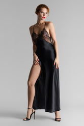 Long dress in silk and eyelash lace. Long flowing ultra-feminine silk garment with slit. V neckline and bare back adorned with rigid lace that delicately hugs the figure. Fine silk adjustable straps with golden accessories cross the back.