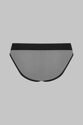 Sheer tulle underwear with bare skin cut-away at the front. A wide elasticated, semi-opaque microfibre-covered band provides good support.