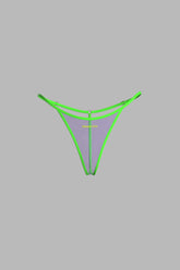 Micro thong in transparent pastel tulle, structured with ultra-flat fluorescent elastic. The sides are adjustable thanks to gold sliders for a precise fit. A central ring at the back enhances the line of the lower back. Maison Close logo in relief at the front. No cotton lining for a completely sheer finish.