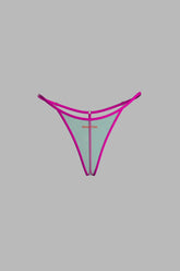 Micro thong in transparent pastel tulle, structured with ultra-flat fluorescent elastic. The sides are adjustable thanks to gold sliders for a precise fit. A central ring at the back enhances the line of the lower back. Maison Close logo in relief at the front. No cotton lining for a completely sheer finish.