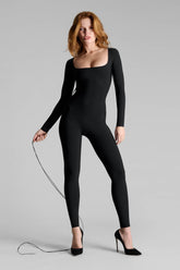 This backless catsuit from the Nuit Infinie collection stands out with its plunging neckline and tailored lines. The adjustable back lacing, secured with a regulator, ensures a precise fit while emphasizing the body’s natural curves. Tapered legs and long sleeves complete its refined and timeless style.