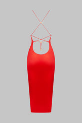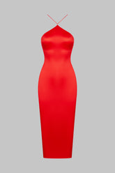 Midi-length dress with semi-cutaway neckline, combining satin softness and unique style. The open back is beautifully enhanced by lacing detailing, the neck is adjustable thanks to unique adjusters and gold lipstick accessories by Maison Close.