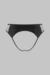 ROCOCO open brief playing with transparency and graphic lines. Two structured cut-outs shape the front, while ultra-sheer tulle subtly reveals the hips. At the back, a daring opening highlights the curves, framed by a velvet elastic that contours the buttocks. This piece is worn as a bold seduction accessory, to be paired with the corsets and bustiers from the ROCOCO line.