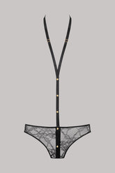 Sheer stretch lace harness briefs. They open front to back with magnetic golden press-studs. Low-rise design and adjustable harness.