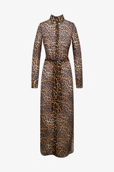 The SAFARI long shirt dress, crafted from sheer leopard silk voile, grazes the skin with lightness. Its straight cut subtly reveals the leg and elongates the silhouette with fluidity. It fastens at the front with contrasting black buttons engraved Maison Close, echoed by wide buttoned cuffs and a classic shirt collar. A removable black belt defines the waist as desired.