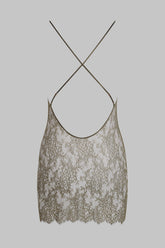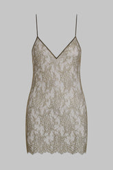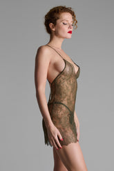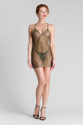 Short dress in sheer eyelash lace. V neckline and a bare back delicately hug the body. Fine silk adjustable straps with golden accessories cross the back.