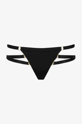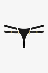 The Fatale String Bikini Bottom is crafted from soft, opaque microfiber for a smooth touch and comfortable fit. The sculpting fabric, lined only at the crotch, delicately hugs the silhouette. Its barrette-style back features graphic lines, while the side elastics, covered in microfiber and joined by golden rings at the front and back, allow for customizable coverage. The thigh elastics are fully adjustable and completely removable thanks to gold metal hooks, offering a refined bondage effect that remains entirely versatile.