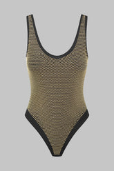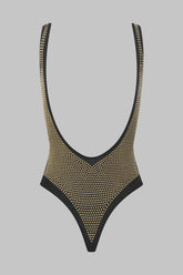 The thong bodysuit stands out with its rock attitude and daringly high-cut silhouette. Its open back reveals an unexpected plunging neckline. Both front and back feature gold-studded panels, adding a luminous, precious touch. A cotton-lined gusset ensures comfort.