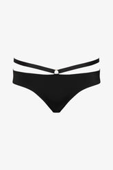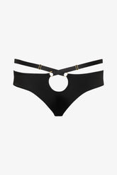 The Tanga bikini bottom Fatale is crafted from soft, opaque, and sculpting microfiber, offering a second-skin effect with ultimate comfort. Its high-cut, slightly high-waisted silhouette elongates the legs while enhancing the waistline. A refined play of bondage-inspired elastics is accentuated by a gold ring at the front and two at the back, revealing an adjustable keyhole detail. The waistband elastic is adjustable via small, non-removable gold-toned metal accents, for a look that is both graphic and minimalist. Lined only at the crotch.