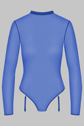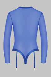 This blue colour long-sleeved thong body features soft mesh with a sheer iridescent appearance.