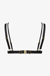 The Triangle bikini top Fatale is crafted from soft, opaque microfiber for a second-skin feel. Its triangle cut, enhanced with bust darts, offers a naturally elegant fit, with no padding or underwire. The standout feature of this piece: a microfiber triangle framed by a subtle play of elastic straps, creating a refined bondage effect. The delicate straps are adjustable with gold-toned metal accents. The back is adjustable and fastens with a gold-colored clasp. A covered elastic under the bust ensures both comfort and support.