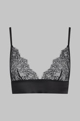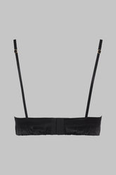 Strapless triangle bra in silk and eyelash lace. Triangle cups without underwire in transparent rigid lace that perfectly hold the breasts. A wide elastic band at the back covered in gathered silk provides perfect support. Fastens at the back with a adjustable clip. Delicate adjustable straps with golden accessories.