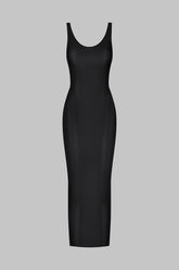 Abito lungo con ampie spalline realizzato in pregiato jersey dai riflessi lucidi e sottilmente trasparenti. Modello aderente foderato con un elastico ultrapiatto e confortevole. La scollatura, il giromanica scavato e la vertiginosa scollatura sul retro ci riportano agli anni '90. La firma dorata del logo Maison Close è presente sull'incavo dei fianchi.