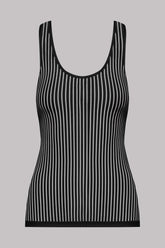 Canotta in microfibra con righe traforate, trasparenti e grafiche. Il taglio iconico del Marcel maschile viene reso femminile da una scollatura arrotondata e una schiena esaltata da un taglio a croce. Bordi rivestiti in microfibra a tinta unita su scollo e giromanica.