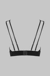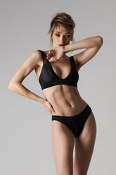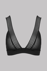 Reggiseno scollo profondo senza ferretto. Le righe traforate, trasparenti e grafiche delineano il décolleté. Coppe strutturate da spalline larghe davanti e regolabili da due elastici dietro. Ampia fascia di sostegno sottoseno rivestita in semplice microfibra nera. Chiusura regolabile con gancetto sul retro.