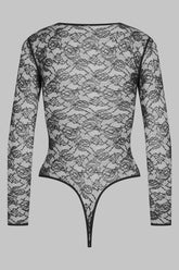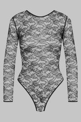 Il body perizoma a maniche lunghe sgambato è ornato con pizzo traforato prevalentemente riciclato. È rifinito con un elastico piatto, e la sua forma molto sgambata risalta i fianchi per un risoluto stile anni '80. Chiusura regolabile con un gancetto sul cavallo.