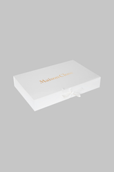 Presenta i tuoi regali con raffinatezza in questa elegante scatola bianca. Decorata con un delicato fiocco in raso bianco, garantisce una chiusura chic e sofisticata. Il logo Maison Close dorato completa il design, aggiungendo un tocco di prestigio ai tuoi regali.