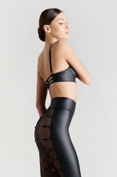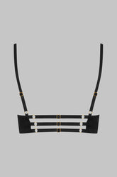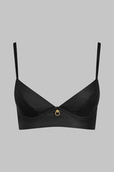 Reggiseno effetto pelle mat senza ferretto. Modello bustier foderato davanti per donare una finitura senza cuciture, coppe con taglio a triangolo. Capo da infilare, con giro schiena regolabile tramite elastici e accessori dorati. Bretelle elastiche e regolabili sul retro. Simbolo della collezione, un anello dorato "feti-chic" sulla scollatura ne che suggerisce l'allacciatura.