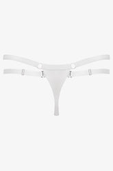 Il string da bagno Fatale è realizzato in microfibra opaca e morbida, per un tocco piacevole e una vestibilità confortevole. Il tessuto modellante, foderato solo al cavallo, avvolge le forme con leggerezza. La sua forma barrette, con retro grafico, è completata da elastici laterali rivestiti in microfibra, collegati da anelli dorati sul davanti e sul retro. Gli elastici sulle cosce sono regolabili e completamente amovibili grazie a piccoli ganci in metallo dorato, permettendo di modulare l'effetto bondage in modo personalizzato.