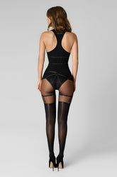 Le giarrettiere PARURE CLOUS nere sottolineano le gambe con eleganza. Impreziosite da borchie dorate, sono composte da fasce elastiche completamente regolabili per adattarsi a tutte le morfologie. Dotate di reggicalze dorati, permettono di abbinare con raffinatezza un paio di calze. Da indossare da sole o coordinate con la culotte e l’harness della linea. Un accessorio di connessione tra il corpo e il dettaglio.