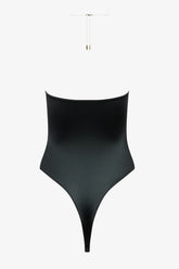 Costume da bagno string intero che unisce morbidezza satinata e stile elegante. Un taglio bustier stile anni '80 sublimato da un gioco di lacci delicatamente plissettati sul davanti. Questo costume offre la possibilità di regolare l'apertura con eleganza grazie a un unico regolatore e ad accessori dorati "lipstick" firmati Maison Close, adattabili secondo i propri desideri.