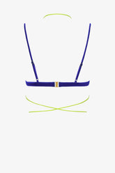 Top da bagno triangle senza ferretti, che unisce morbidezza satinata e stile. Progettato per adattarsi perfettamente alla forma del seno grazie alle coppe triangolari modellate senza cuciture. L’allacciatura attorno al collo, completamente amovibile e regolabile tramite un unico regolatore e accessori dorati "lipstick" firmati Maison Close, valorizza il décolleté permettendo una personalizzazione a piacere. Le sottili bretelle piatte e regolabili garantiscono una vestibilità perfetta. Una fascia elastica sotto il busto avvolge e modella delicatamente il seno. Chiusura con gancio gioiello sulla schiena.