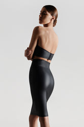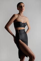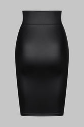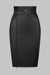 Gonna effetto pelle mat. Taglio molto aderente e vita ampia che sottolinea la silhouette. Apertura davanti con cerniera bidirezionale tono su tono. Simbolo della collezione, un anello dorato "feti-chic" sul davanti che ne suggerisce l'allacciatura.