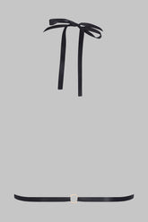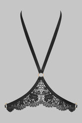 Pregiata imbracatura in guipure che abbraccia il collo e sotto il petto. Veste la pelle come un gioiello e valorizza il décolleté. Da portare sulla pelle o da abbinare al proprio guardaroba. Delicati nastri di raso nella parte posteriore regolabili grazie a pregiati accessori dorati e da legare o slegare a seconda dei desideri.