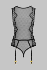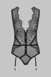 Body a perizoma senza maniche con scollo a V che abbina pizzo gotico a ciglia rigide e tulle plumetis elasticizzato. Gioco di cuciture in picot elasticizzato e di bottoni dorati che strutturano la figura. Apribile e regolabile al cavallo con un gancetto. Arricchito da 4 stringhe reggicalze con finiture dorate regolabili e staccabili.