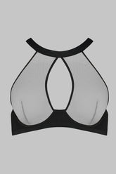 Lo scollo profondo a goccia lascia intravedere la pelle, sottolineato da un bordo in tulle che delinea con precisione. Con ferretto, ma senza imbottitura né fodera, offre un sostegno naturale e un look libero, senza artifici. Si chiude sul retro con un gancetto discreto e si regola con spalline regolabili.