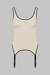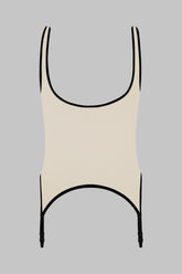 Lo scollo arrotondato e la schiena vogatore disegnano una linea unica, mentre il seno rimane completamente visibile in un gioco di trasparenze dichiarate. Le giarrettiere regolabili e non rimovibili aggiungono struttura al capo, da indossare con o senza calze, secondo l’umore.