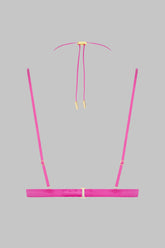 Reggiseno a triangolo aperto, che unisce morbidezza satinata e audacia. Progettato per rivelare il seno con stile. L'allacciatura al collo, riposizionabile e regolabile grazie a un sistema di regolazione unico e agli accessori dorati a forma di rossetto con logo Maison Close, valorizza la scollatura consentendo la personalizzazione secondo i propri desideri. Le spalline sottili, piatte e regolabili garantiscono una vestibilità perfetta. Una fascia elastica attorno al busto struttura il seno. Chiusura con gancio regolabile dietro.