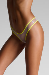 Perizoma in tulle trasparente color pastello impreziosito da un elastico ultrapiatto color neon. Taglio anni '80 con fianchi sgambati che slanciano le gambe. Logo Maison Close in rilievo sul retro. Sfoderato per una trasparenza totale.